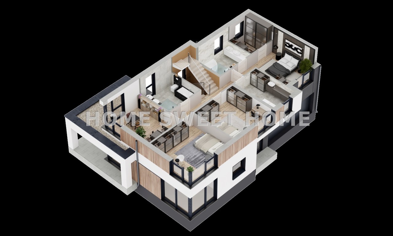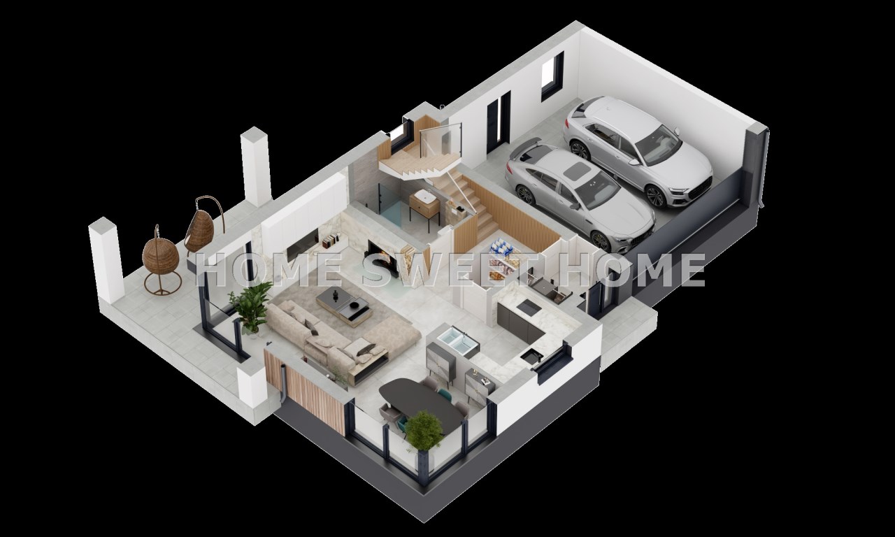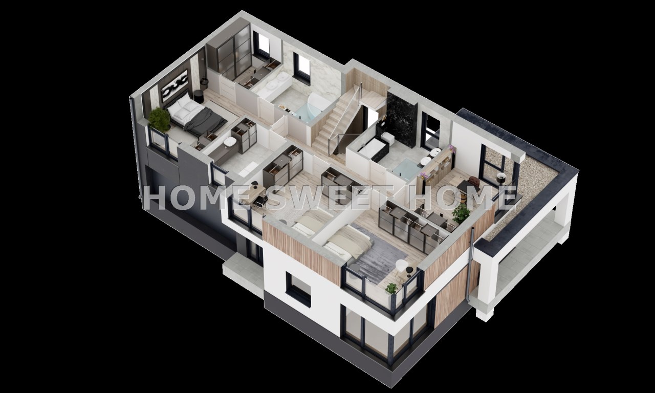 Domy o lustrzanym odbiciu, każdy z domów to ok. 250 m² starannie zaprojektowanej powierzchni, w tym poddasze użytkowe z potencjałem aranżacyjnym dopasowanym do indywidualnych potrzeb.