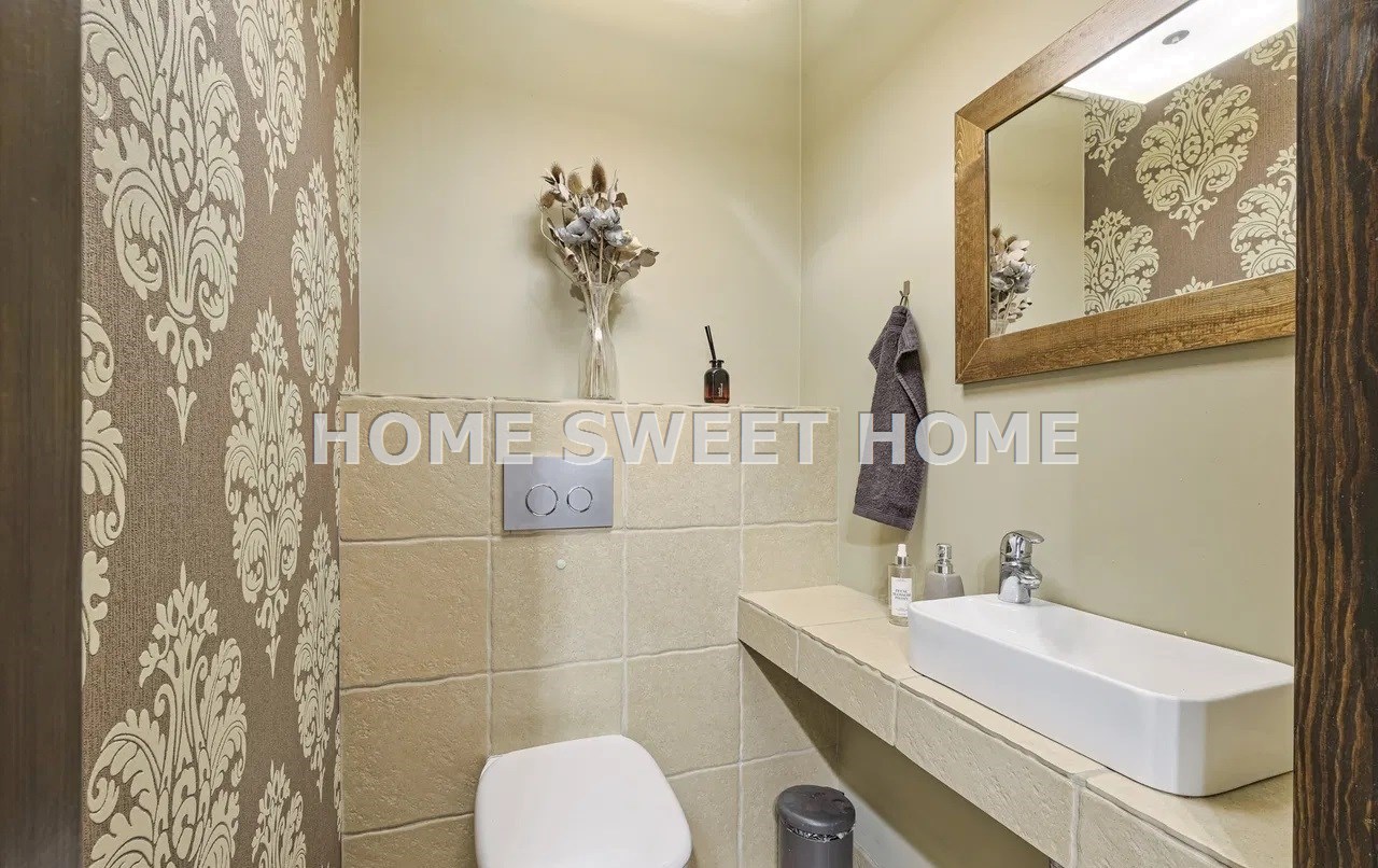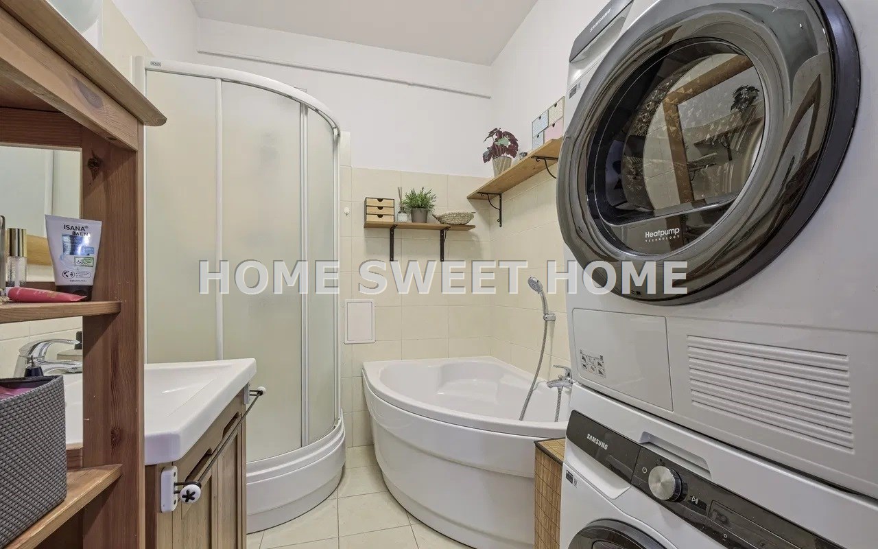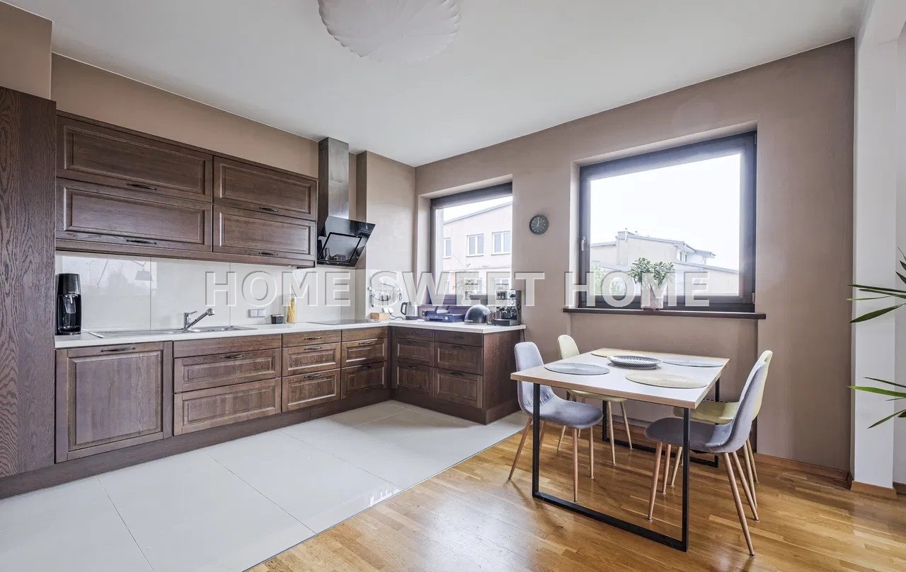 Na podłogach dębowy parkiet, dobrej klasy terakota oraz armatura firmy Hansgrohe. Drewniane okna, parapety i drzwi. Większość mebli i wyposażenia pozostaje w mieszkaniu.
