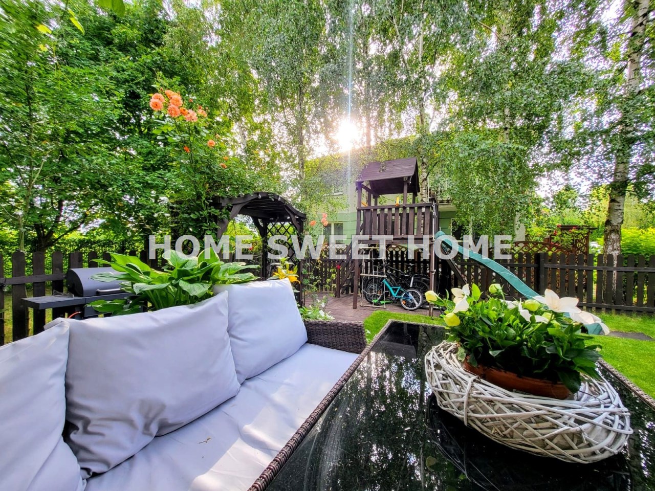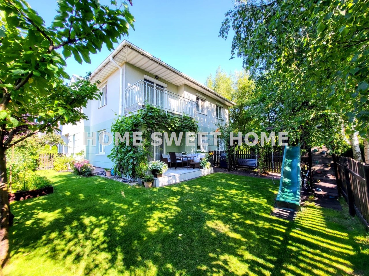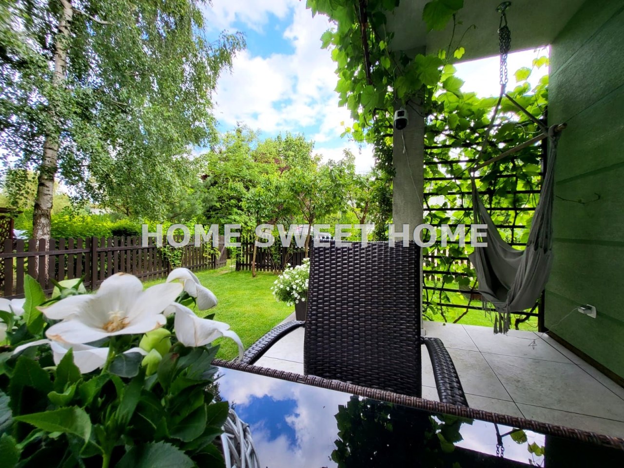 Duży, zadbany ogród z tarasem to idealne miejsce do wypoczynku, uprawy roślin i zabawy dla dzieci (znajduje się tam drewniany domek dla dzieci ze zjeżdżalnią, ścianką wspinaczkową, a w ogrodzie rosną winogrona, borówki, maliny, czereśnie, na tarasie meble ogrodowe).