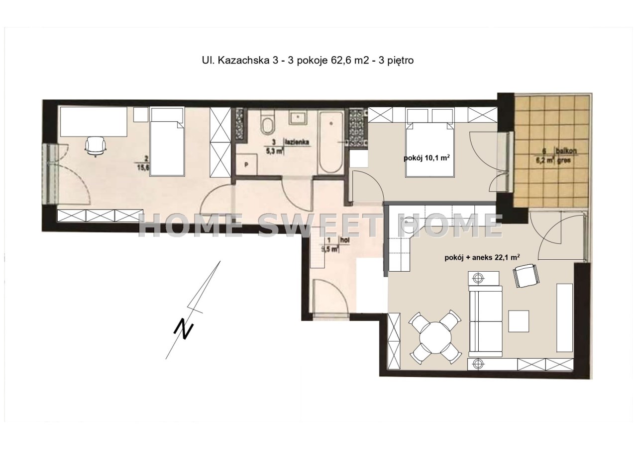 3-pokojowe funkcjonalne, dwustronne mieszkanie na 3 piętrze (63 m²) przy ul. Kazachskiej 3
