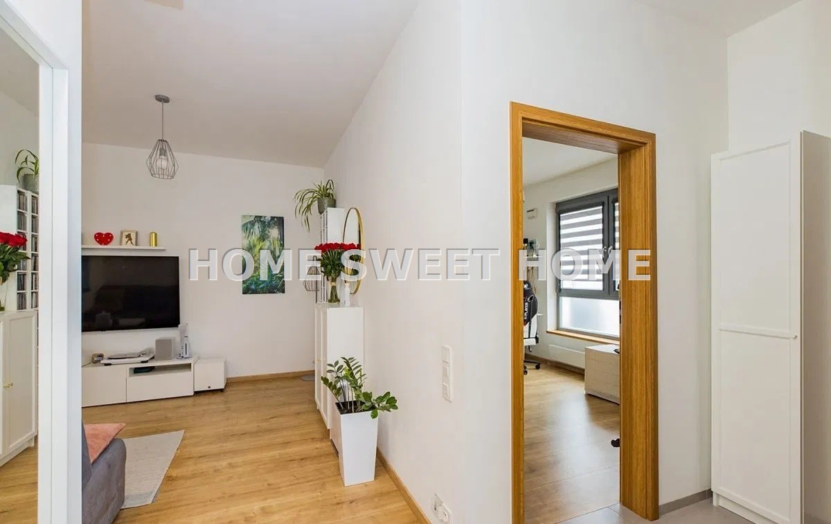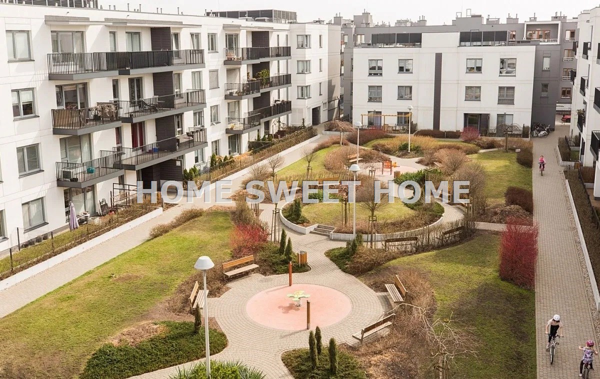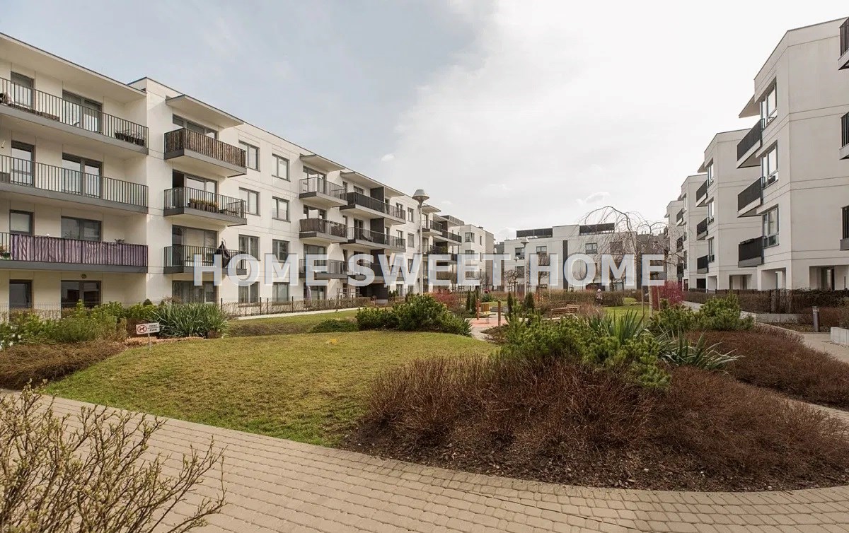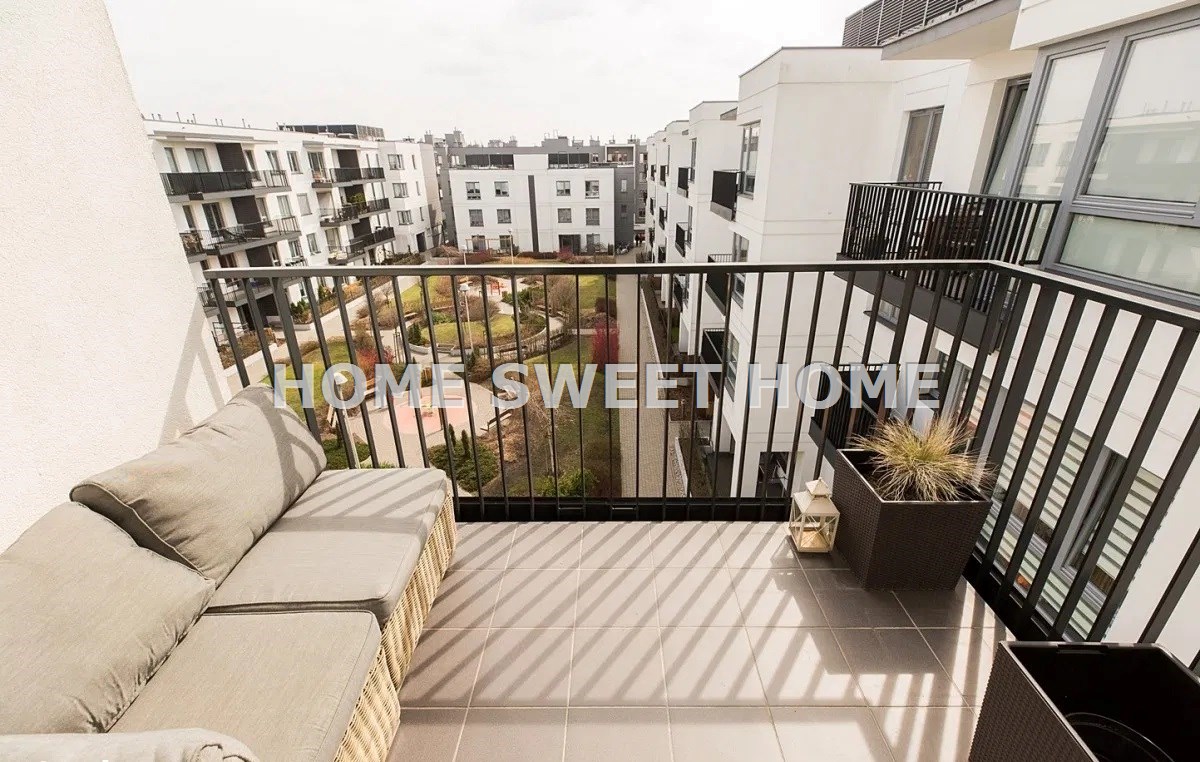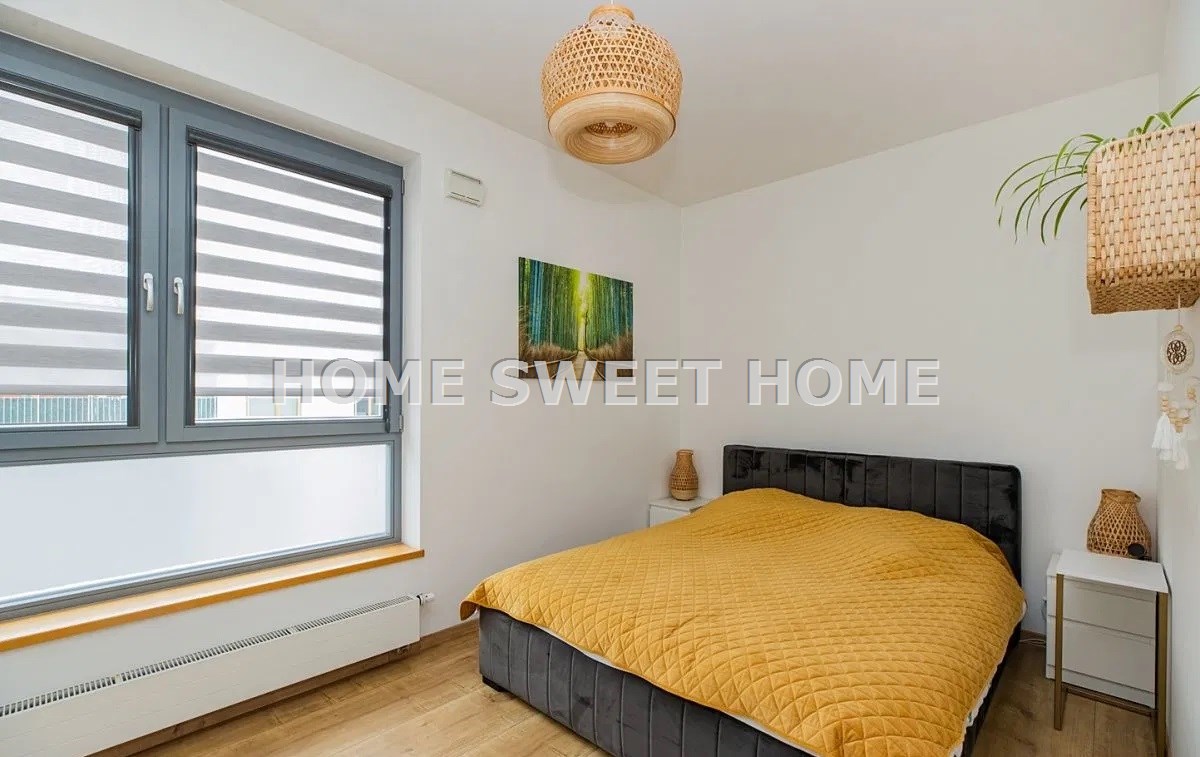 Mieszkanie dwustronne: widny salon z aneksem kuchennym, balkon z widokiem na zielone patio od strony południowej, a obie sypialnie od północnej. Funkcjonalny rozkład pomieszczeń. Pokoje są bardzo ustawne, o zbliżonym metrażu. Sypialnia master z szafą na wymiar w zabudowie. Druga może posłużyć jako pokój dla dzieci lub gabinet. Apartament jest bardzo zadbany i wykończony naturalnymi, bardzo dobrymi jakościowo materiałami.