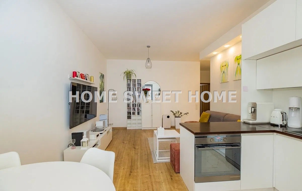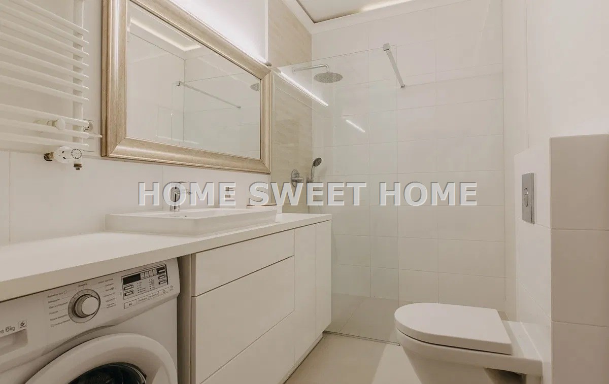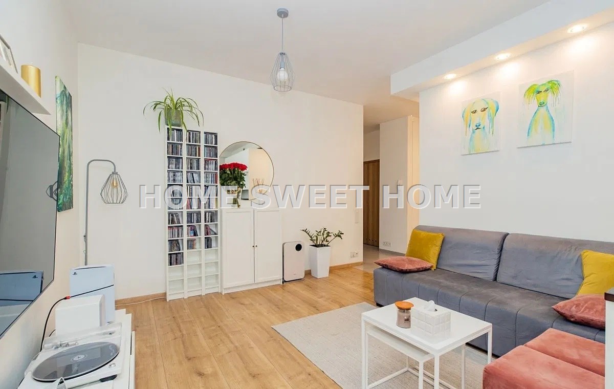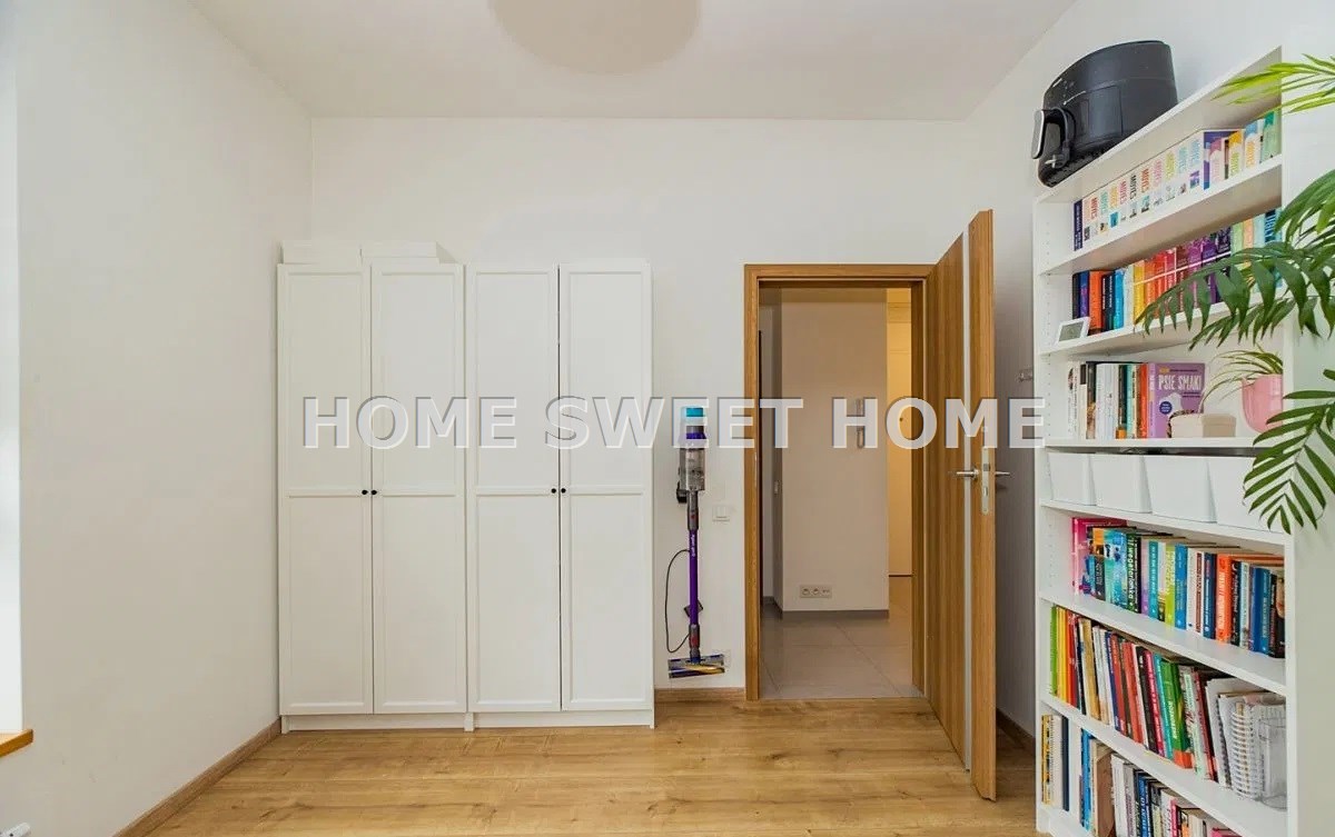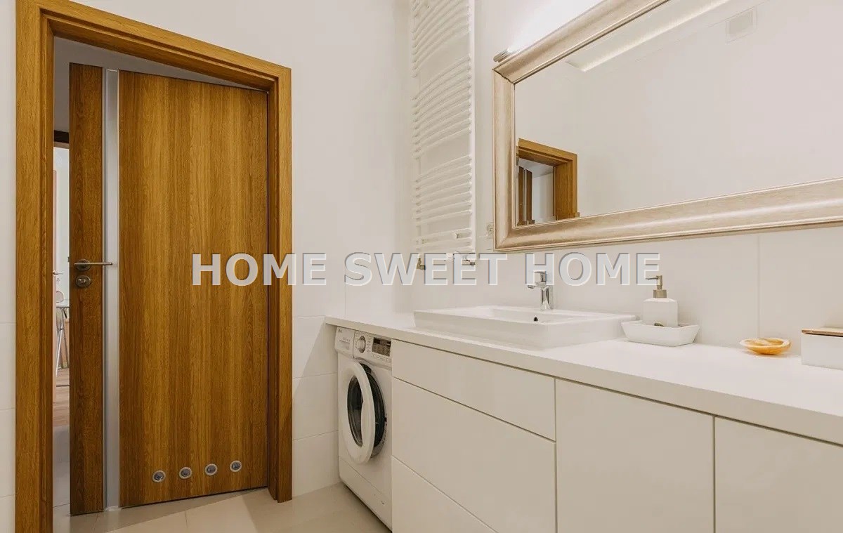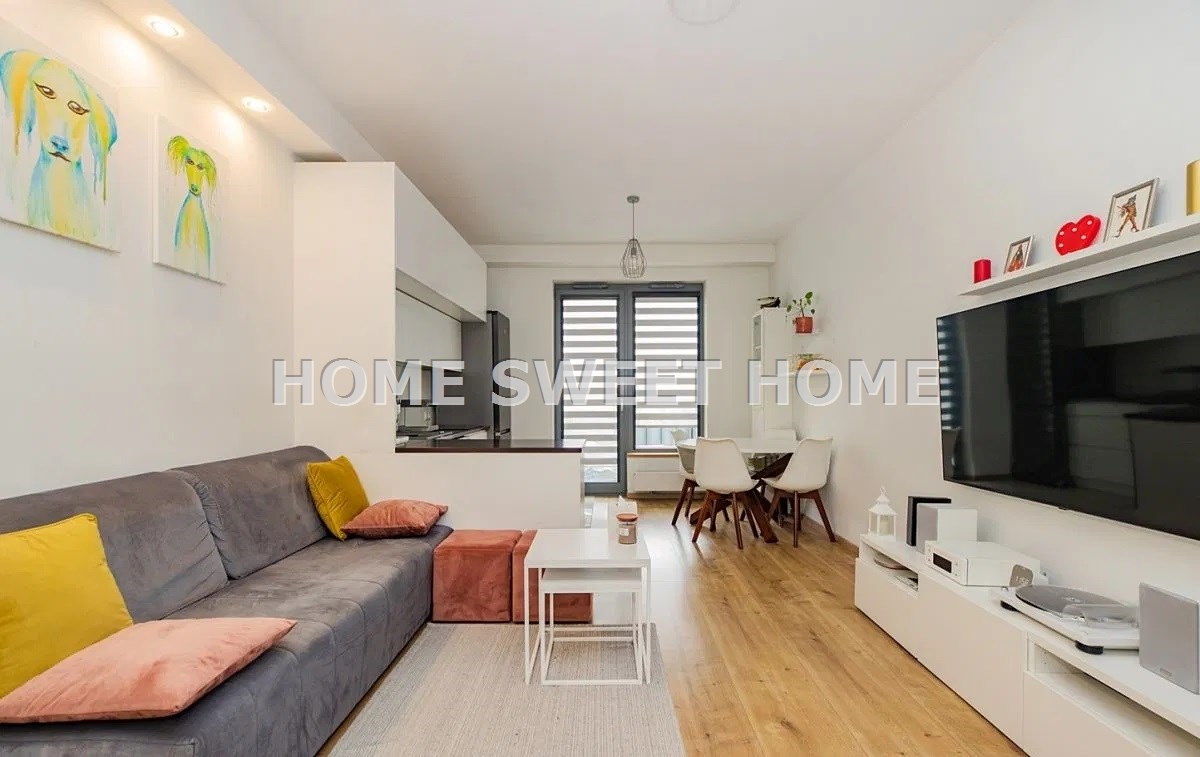 Mieszkanie dwustronne: widny salon z aneksem kuchennym, balkon z widokiem na zielone patio od strony południowej, a obie sypialnie od północnej. Funkcjonalny rozkład pomieszczeń. Pokoje są bardzo ustawne, o zbliżonym metrażu. Sypialnia master z szafą na wymiar w zabudowie. Druga może posłużyć jako pokój dla dzieci lub gabinet. Apartament jest bardzo zadbany i wykończony naturalnymi, bardzo dobrymi jakościowo materiałami.