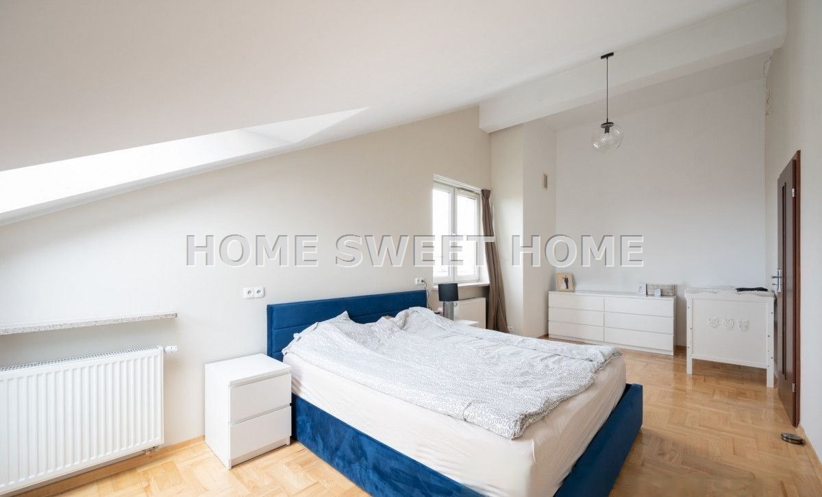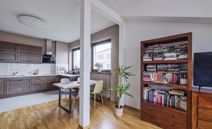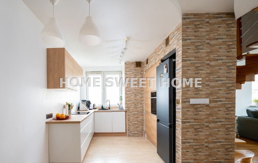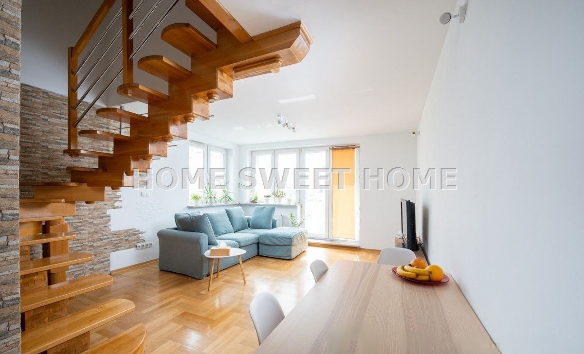 Dwupoziomowy lokal mieszkalny składający się z 4 pokoi, kuchni, 2 łazienek, garderoby i przedpokoju o łącznej powierzchni użytkowej 104,35 m². Balkon 6 m².