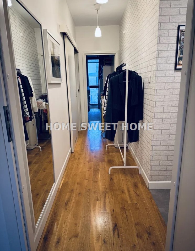 Mieszkanie jest dwustronne (wschód–zachód), z dużymi oknami i loggią, co zapewnia dobre doświetlenie przez cały dzień. W całym mieszkaniu położone są dębowe deski, a w łazience i przedpokoju – szary gres.