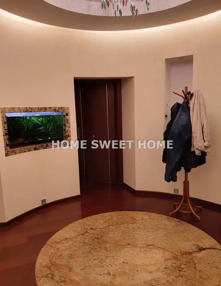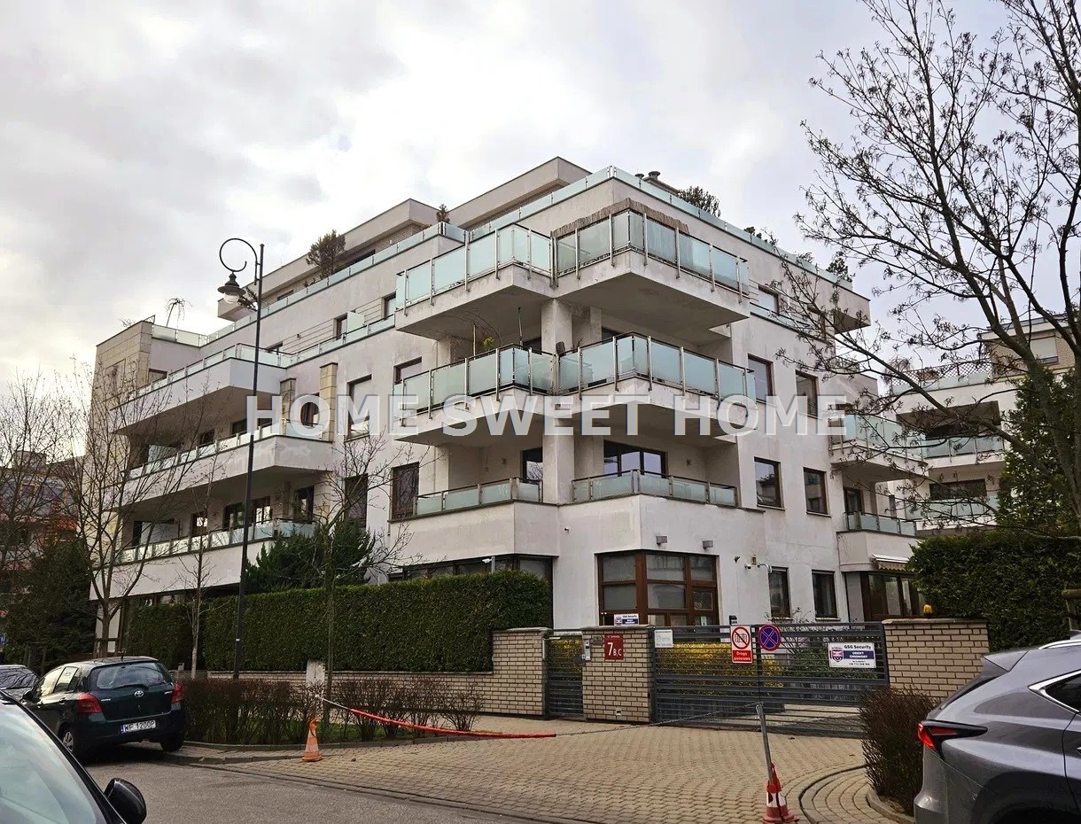 Pięciopokojowy, trójstronny apartament z tarasem, balkonem i 2 miejscami postojowymi w garażu, położone w centrum miasteczka Wilanów, przy ulicy Sarmackiej i Osi Królewskiej.