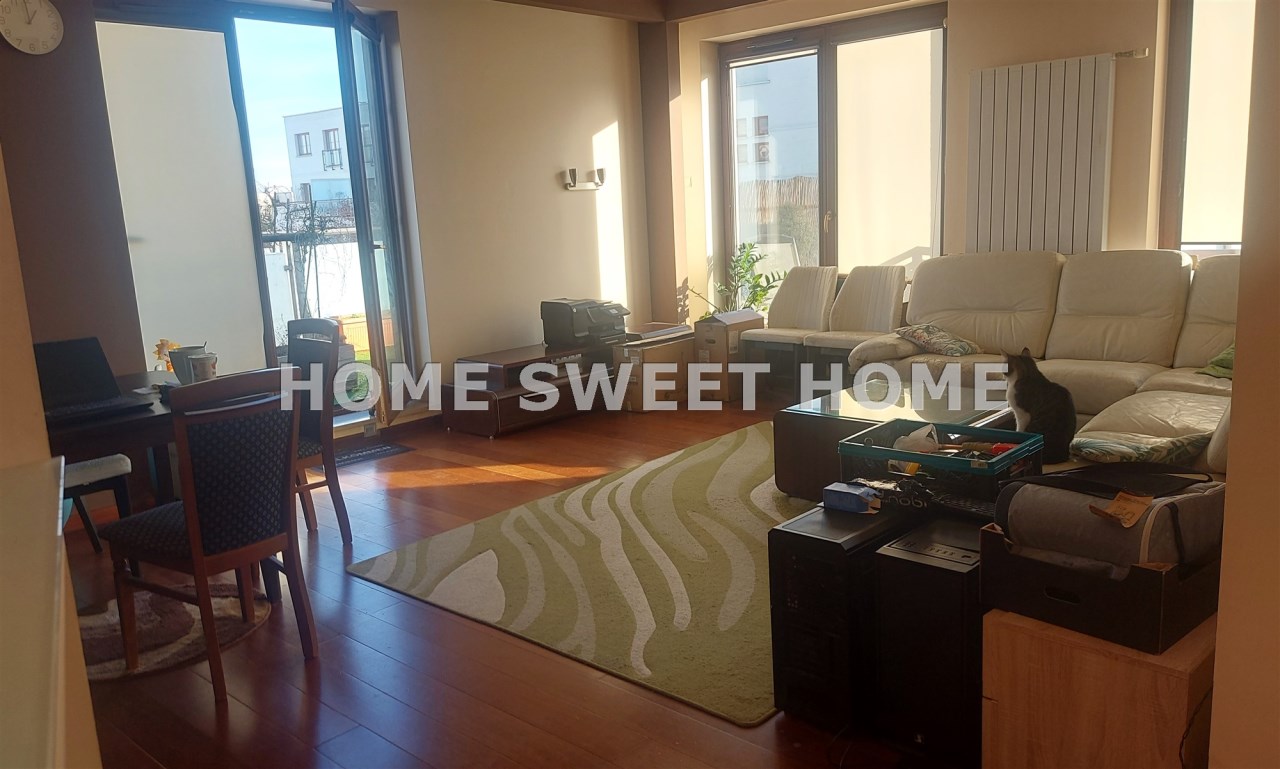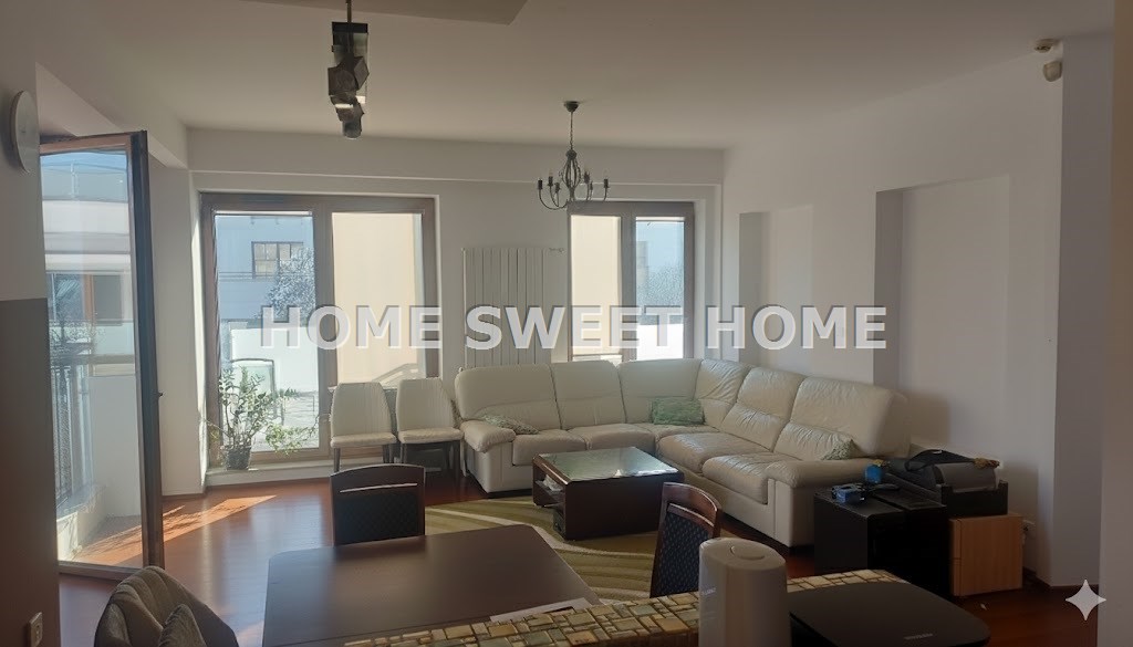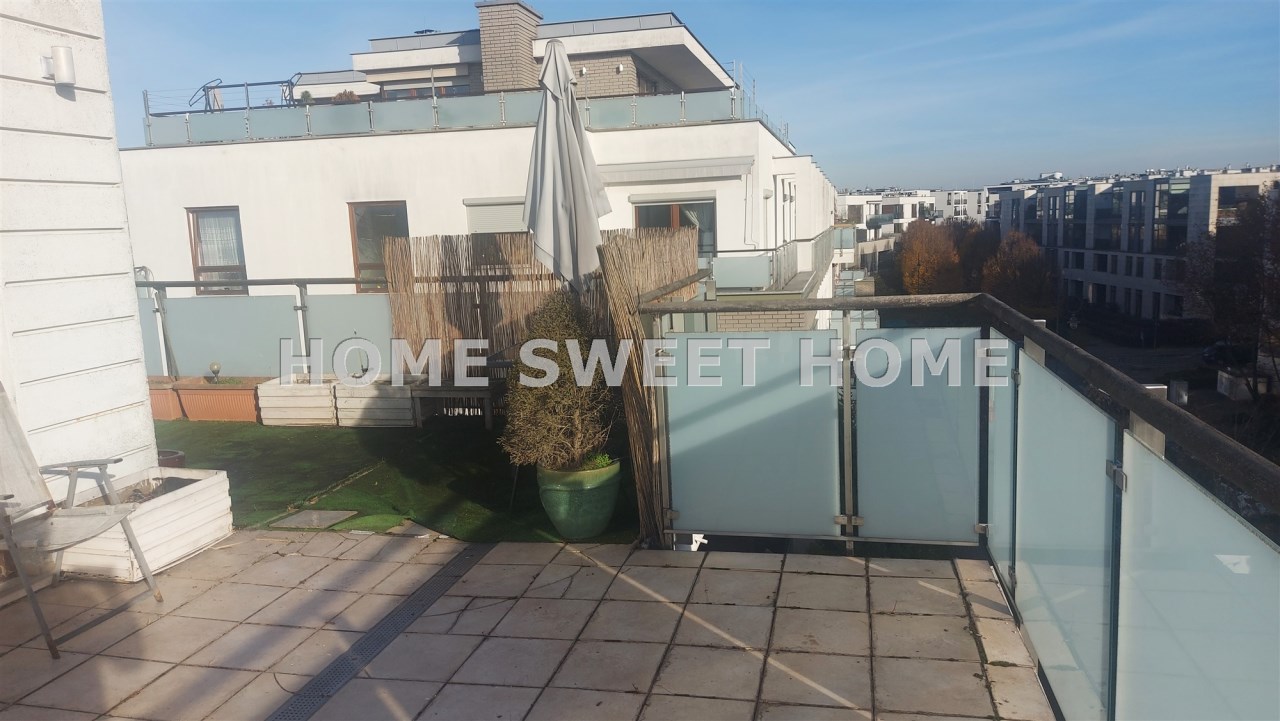 Pięciopokojowy, trójstronny apartament z tarasem, balkonem i 2 miejscami postojowymi w garażu, położone w centrum miasteczka Wilanów, przy ulicy Sarmackiej 7, blisko Osi Królewskiej.