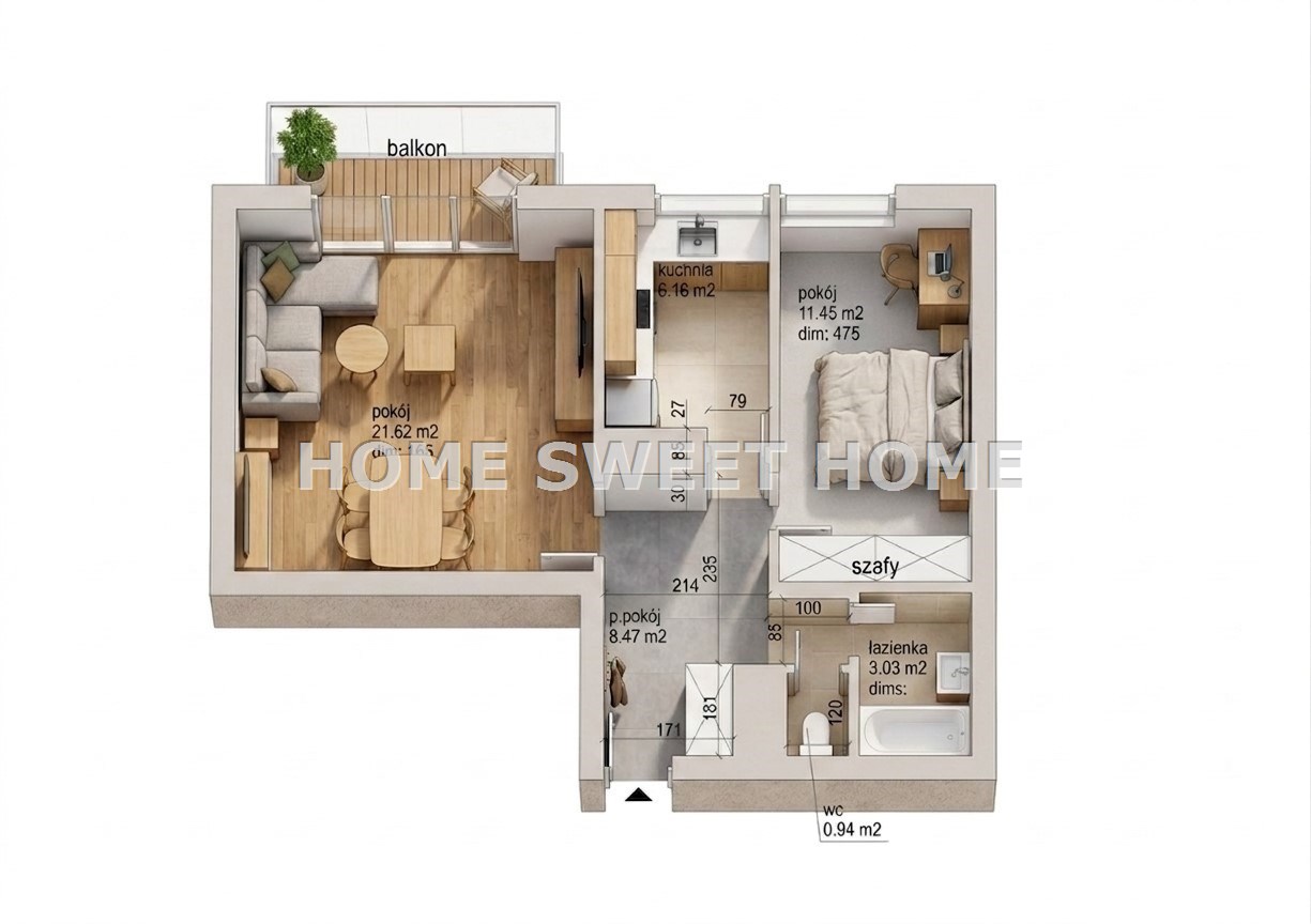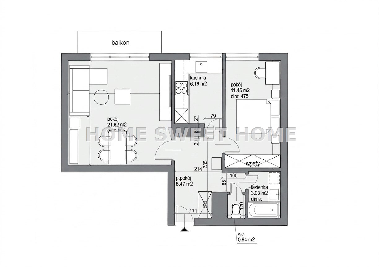 Salon (21,62 m²): Przestronny i słoneczny, z wyjściem na duży balkon – serce domu.