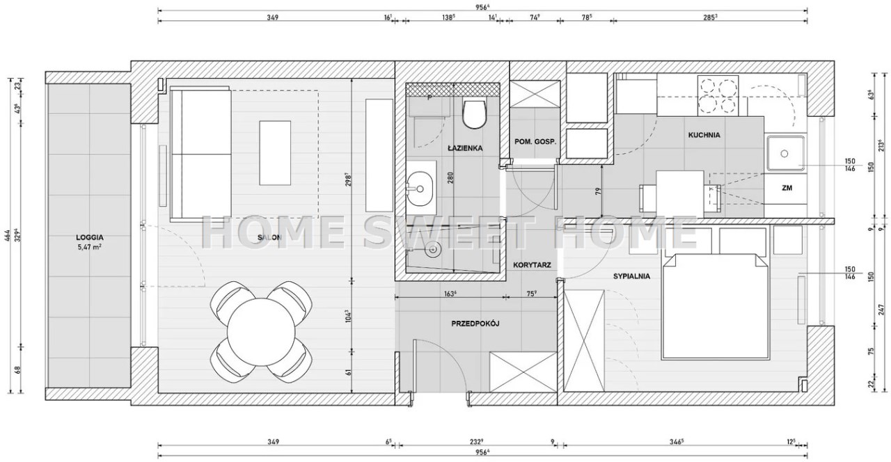 • Schowek/pomieszczenie gospodarcze między kuchnią a łazienką – bardzo praktyczne rozwiązanie